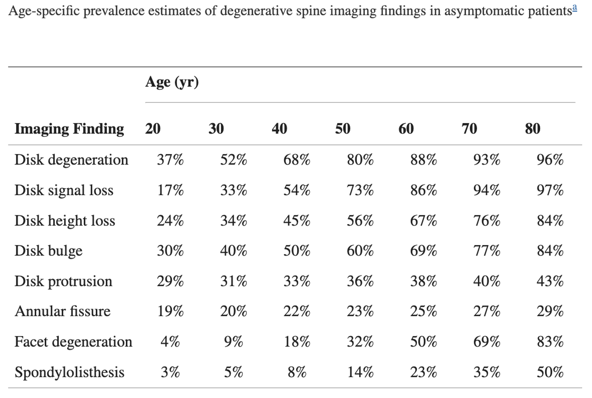 The researchers found that in these people without any history of lower back pain, not even a single day, they had degenerative changes on their lumbar spine scans. On top of that, they found that in all the conditions they assessed for, the percentage of people with these lower back changes increased with age. Below is a table of their findings.
